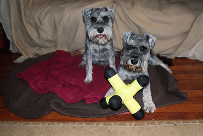 Max - "S'mine!"JD - "No - S'MINE!!" Max - Sasha and Rupert - we can't thank you enough for these amazingly cool toys - they are SO much fun!JD - You are the best-est pals a couple of schnauzers could have. And the prettiest (with gorgeous eyes!) and most dynamic (and licky!) pals too!Max - Yup - you two ROCK! JD - We also got a new toy from FH and MH - it's real fun to play tug and chase with - check it out here....